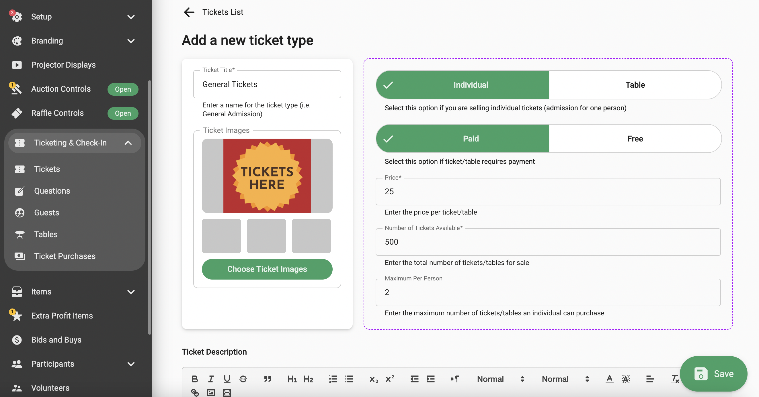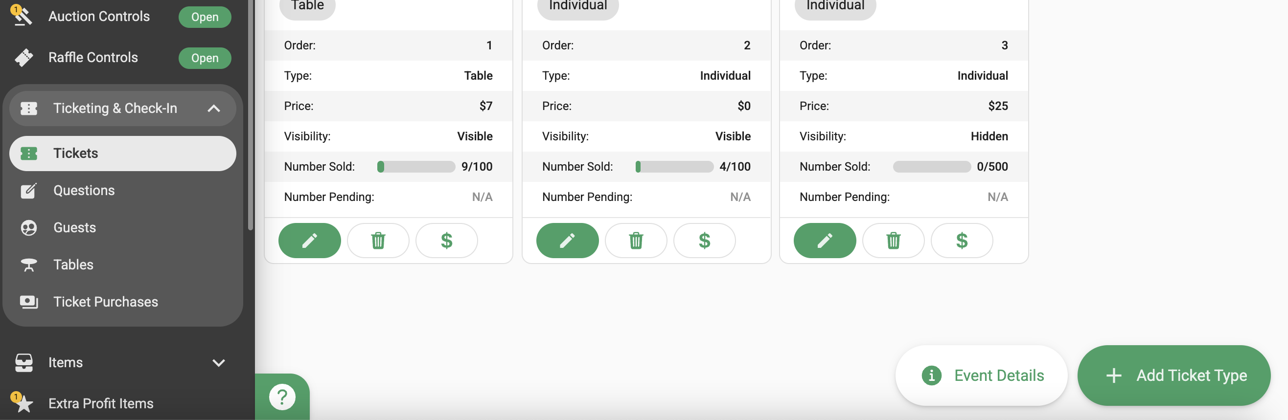 First you will need to setup your ticket item under the 'Ticketing & Check-In' section under the 'Tickets' tab by selecting 'Add Ticket Type' option on the bottom right corner on your dashboard.