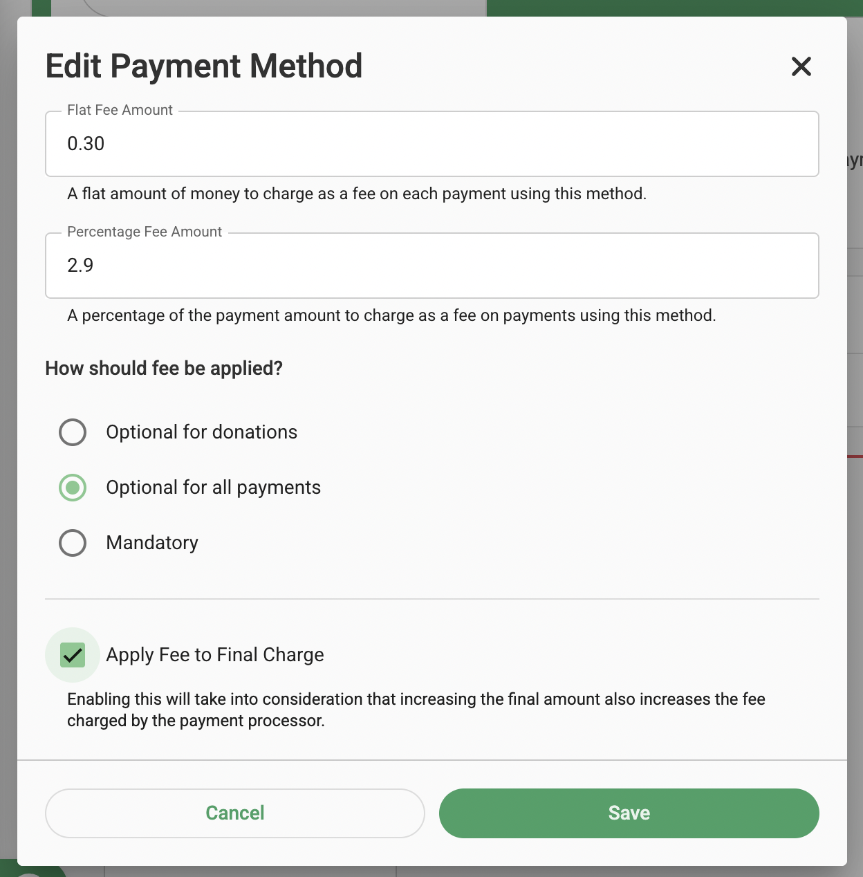 Step 4) Check the box Apply Fee to the Final Charge to enable GalaBid to adjust the percentage to compensate for the fact Stripe fees are charged on the new invoice amount.