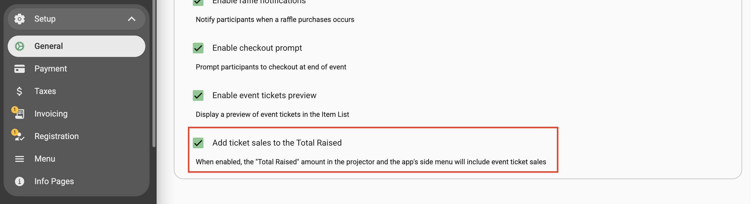 To include the proceeds from event tickets in the total raised amount, go to Setup > General > Advanced Options and check the box and Save.