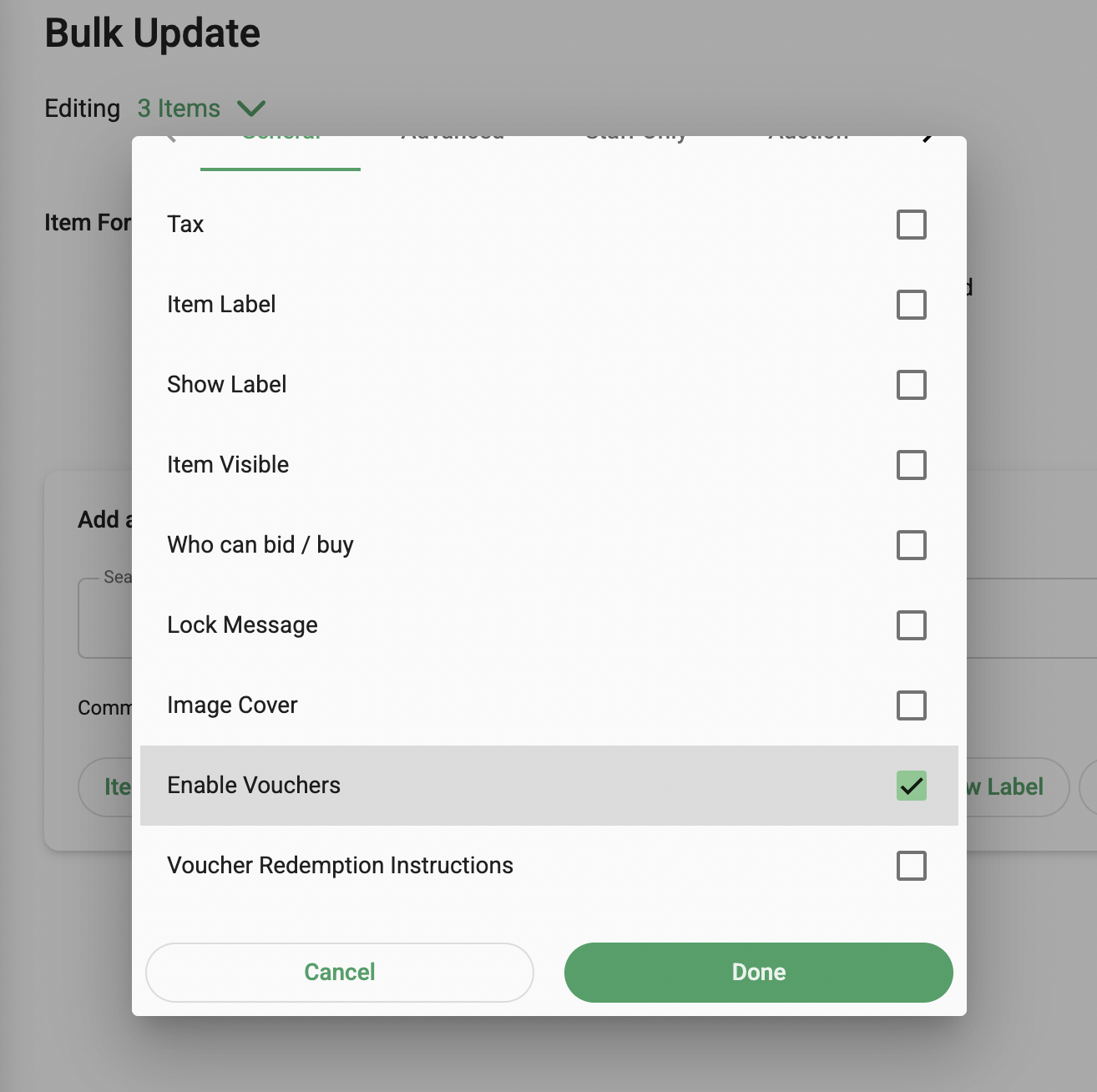 You will find the enable vouchers feature under the advanced options of the item. This can also be done in the bulk update section under the 'browse all fields' < enable vouchers.