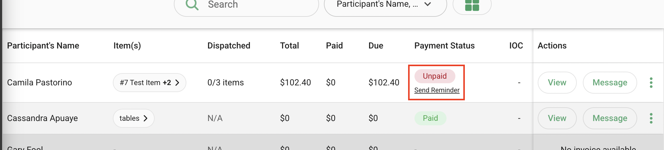 Click Checkout Console section in the side menu. Search the participant's name. On the far right of the screen in the Payment Status Column click Send Reminder. This sends a reminder to the individual.