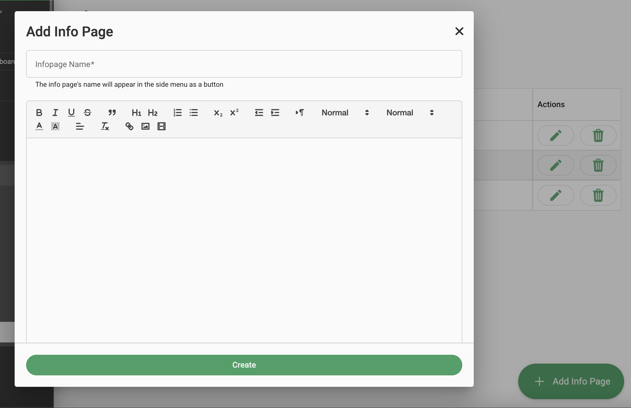 Click '+ Add Info Page' this will take you to create your info page, the layout for this will look similar to a word document, name your info page in the 'Name' field and this is how it will appear on the front end for your participants on the lefthand sidebar.