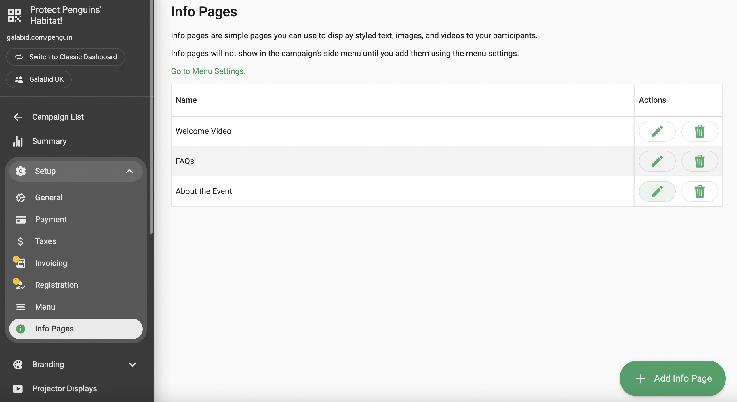 This article will give you an overview of the info page and how to set one up on the GalaBid platform