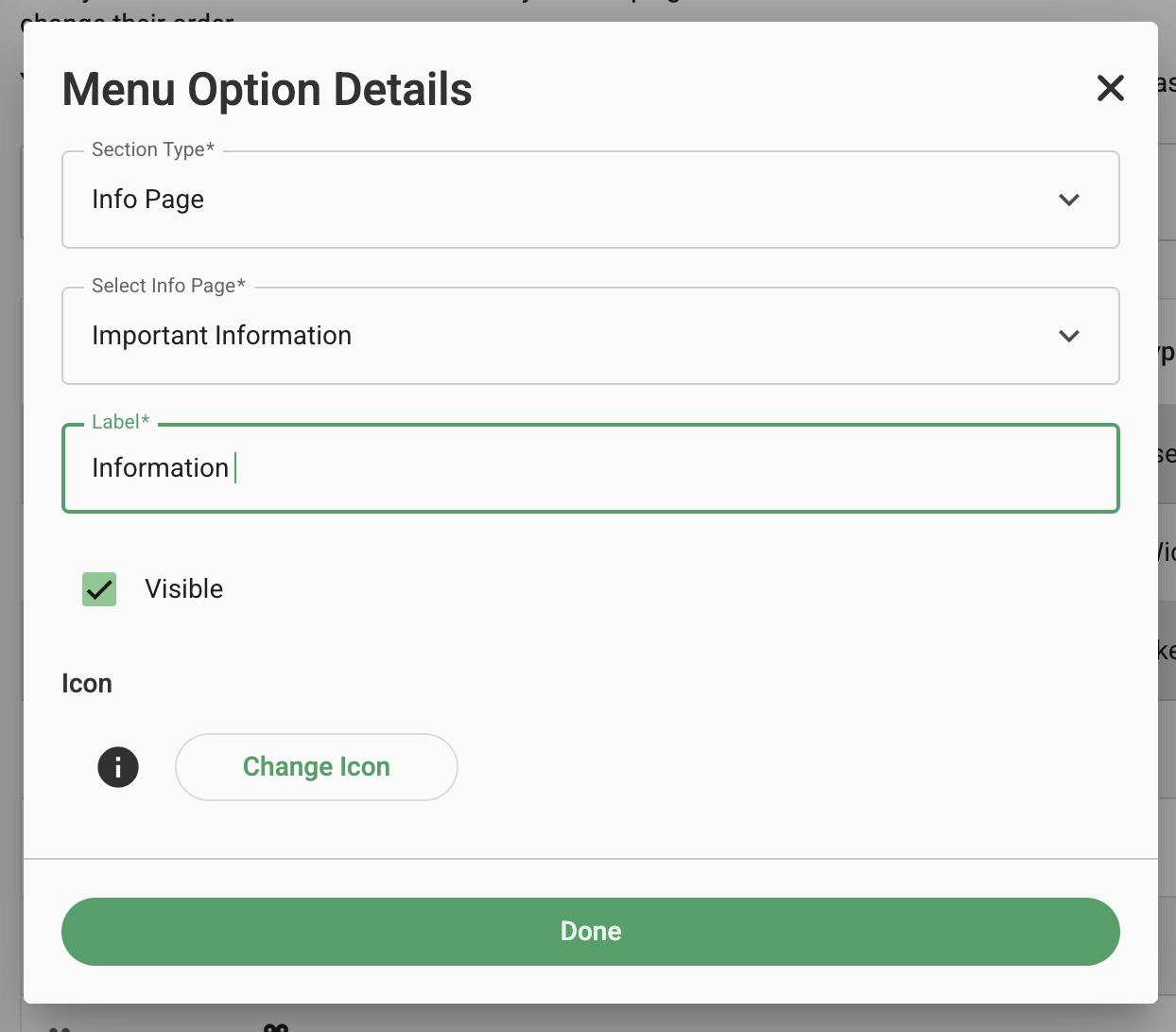 Click '+ Add Menu Item' and the popup will display to add a new menu option, in section type select info