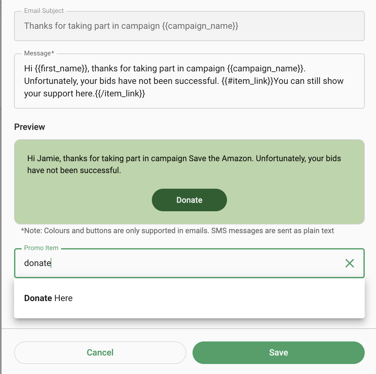 If you click on the 'Promo item' field you can choose a specific item to be included as the item link placeholder. This is the case for the 'Unsuccessful Bidder' notification, if you add your donation item, this donation item will be included in the notification. This will make it easy for participants receiving this notification to make a donation upon the auction closing.