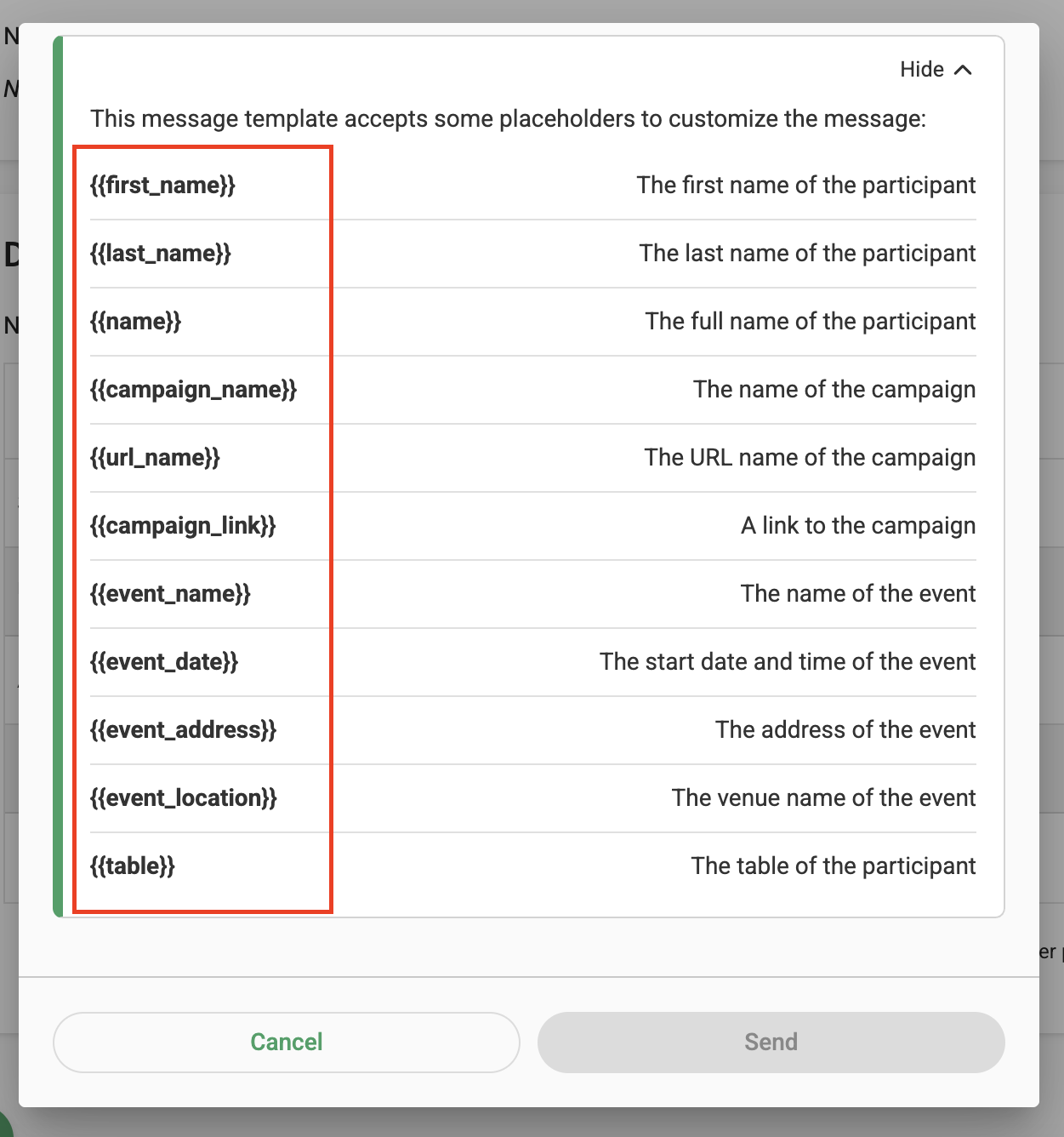 Placeholders can be used to customise your message, by entering the placeholder as highlighted in the image below it will automatically include that information in the message, so for example if you input: Hi! {{first_name}} Welcome. : it will display the name of the participant on that account.