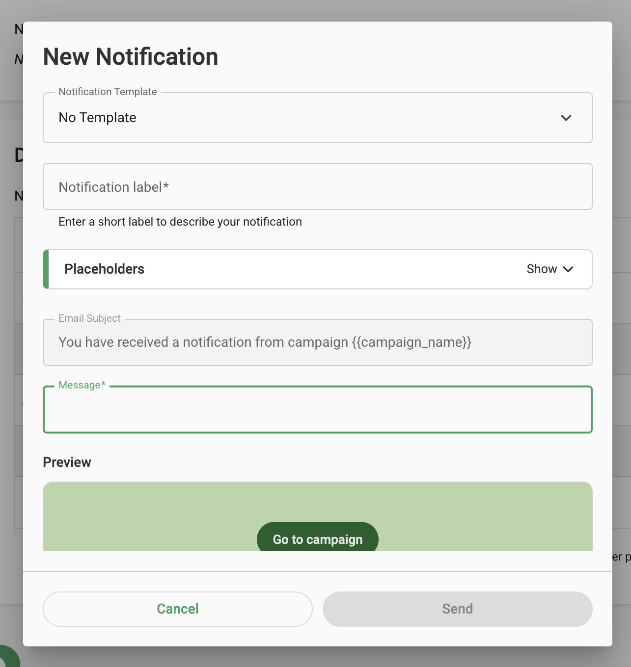 The Communications Section allows you to send or schedule bulk notifications to participants in your campaign. Choose from popular template notifications or customize your own. Include campaign or promoted item links.