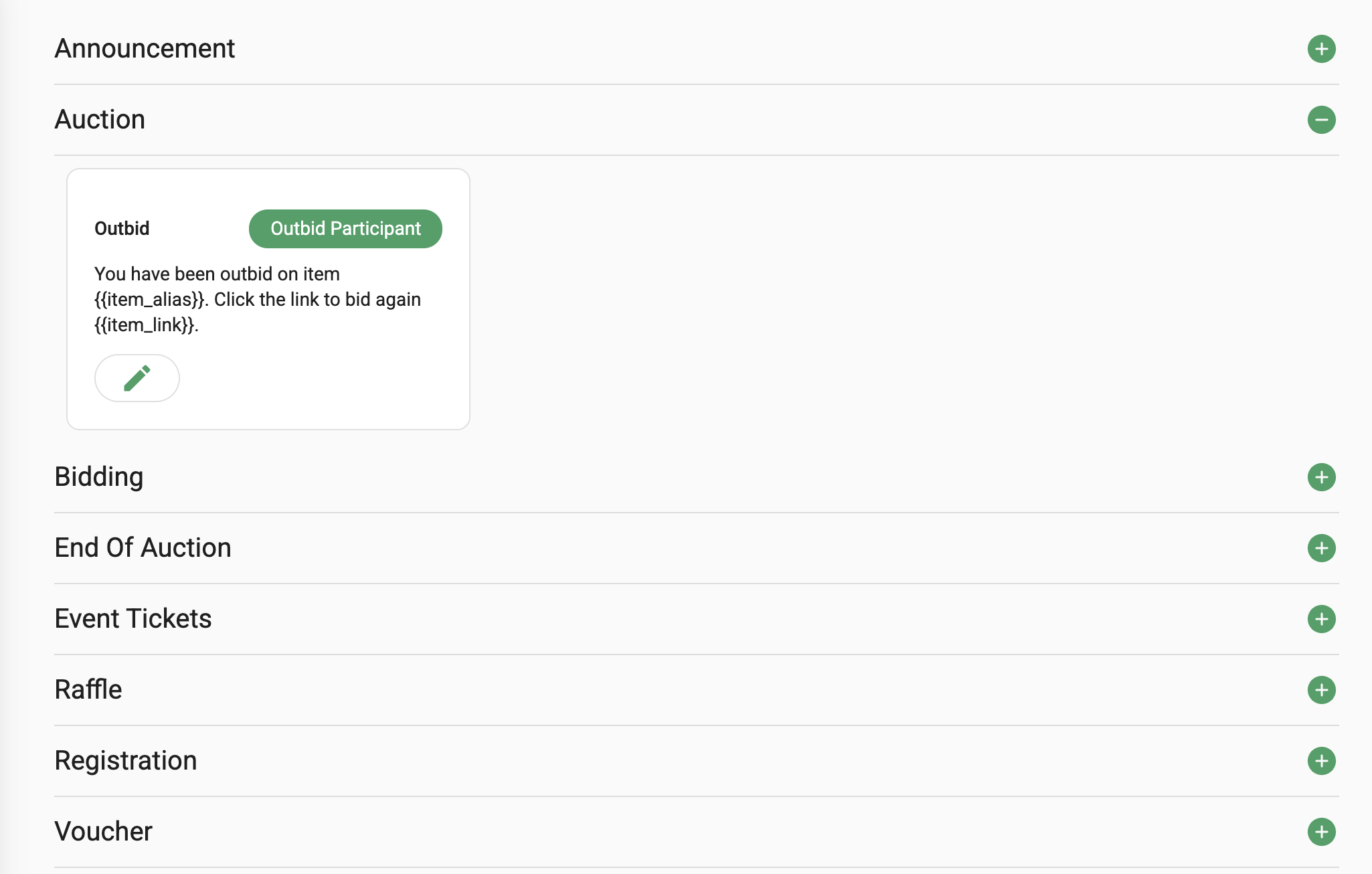 This module also allows you to preview all default notifications. You can edit specific default notifications, such as winning bidder and unsuccessful bidder notifications on auction campaigns.