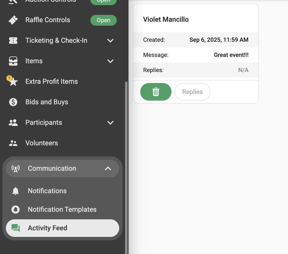 On the Activity feed page you can view all the messages sent on your campaign from your participants, you can delete the messages here but to reply you will need to go to the front end or under the participants tab send a direct message to that participant.