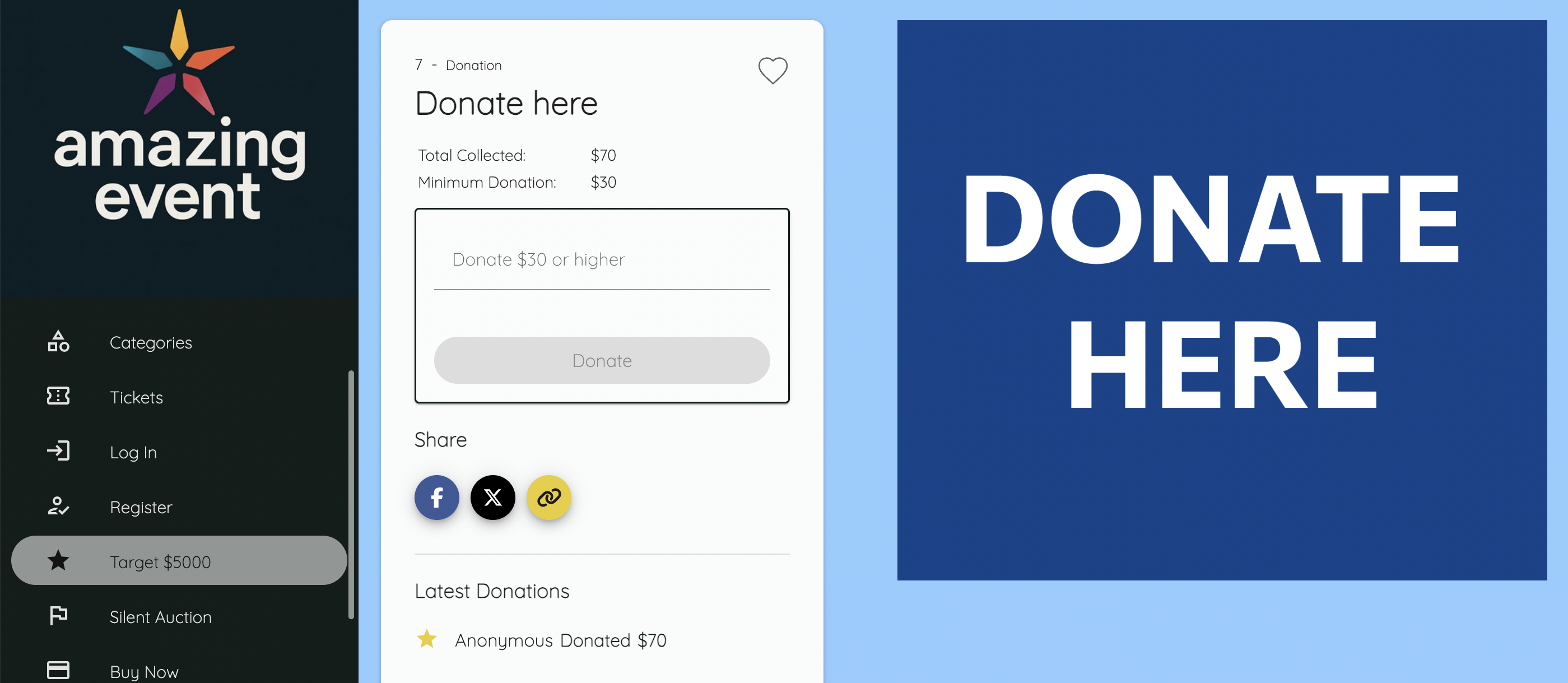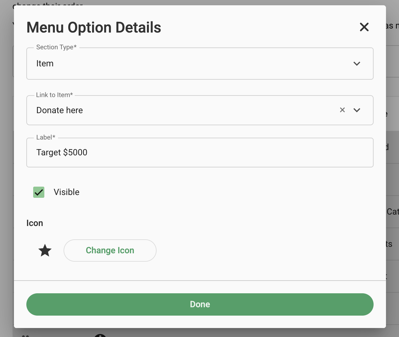 2) The menu option fields will then be displayed. Simply name your menu item your donation amount and link the menu item to your donation item or an Info Page including information about the cause and the campaign target. Here is our video on setting up a Donation item
